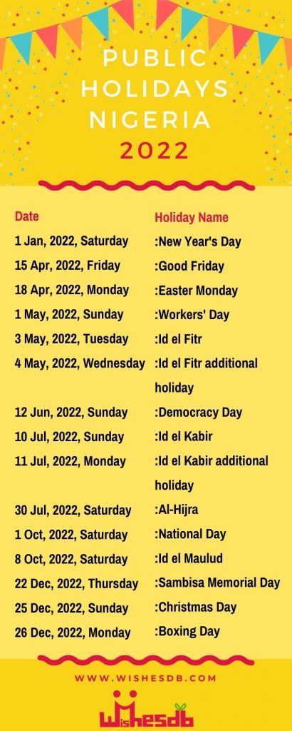 PUBLIC HOLIDAYS Some Tourist Attractions Obudu Cattle Ranch Resort Calabar Tinapa ResortYankari Games ReserveBonny Island BeachGurara Water FallsBar Beach & Kuramu Beach PUBLIC HOLIDAYS IN NIGERIA EventDayMonthNew Year AnniversaryFirst DayJanuaryThe Feast of the Ram (Eid-Kabir)Moveable HolidayMoveableGood Friday HolidayMoveableMoveableEaster Monday HolidayMoveableMoveableMay Day HolidayFirst DayMayDemocracy DayTwelfth Ninth DayJuneNational DayFirst DayOctoberEnd of Ramadan(Eid el Fitr)MoveableMoveableChristmas DayTwenty FifthDecemberBoxing DayTwenty SixthDecember Quick Links> Ministry of Foreign Affairs> Nigerian Immigration Service> Nigerian Customs Service Quick Links> Nigerian News Update> Nigerian Culture and Tourism> JAMB Useful Downloads> Consular ID Card Application Forms> STR Visa Application Form> Entry Permit Application Form CONTACT